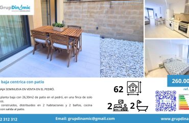 PLANTA BAJA SEMINUEVA EN VENTA EN EL PEDRÓ. En venta planta baja con 26,30m2 de patio en el pedró, en una finca de solo tres vecinos. 62,70m2 construidos, distribuidos en 2 habitaciones y 2 baños, cocina comedor con salida al patio. Aire acondicionado frio/calor. Totalmente amueblada. Año de construccion 2016. A 4 minutos caminando a la playa. -------------------------------------------------------------------------------------------------------------- Desde la calle más comercial de Palamós, a dos pasos del Museu de la Pesca y de la Lonja, y a pocos minutos de la Platja Gran. En una finca de tres vecinos construida en el año 2016, encontramos esta confortable vivienda en planta baja. Cabe resaltar cómo características, que a pesar de estar ubicada en el centro se respira tranquilidad y silencio en sus estancias. Dispone de 62,70m2 construidos, que se distribuyen en un hall de entrada, una cocina office equipada y un salón diáfano con acceso a un patio de 26,30m2, ideal para disfrutar de momentos inolvidables de ocio, solo o en compañia. Las habitaciones son dos, con armarios empotrados y dos baños completos. Aire acondicionado frio/calor. Totalmente amueblada. ¡Venga a visitarlo!